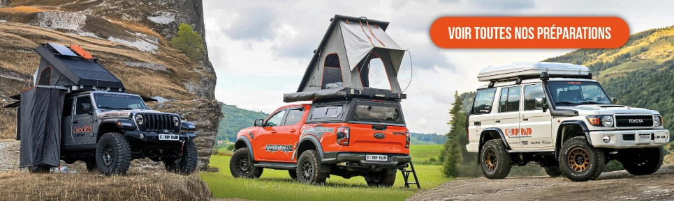 Nos préparations 4x4 et pick-up en détail avec une large gamme d'accessoires et d'équipements pour le bivouac et le raid, mais aussi des préparations axées offroad et franchissement !