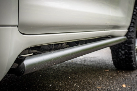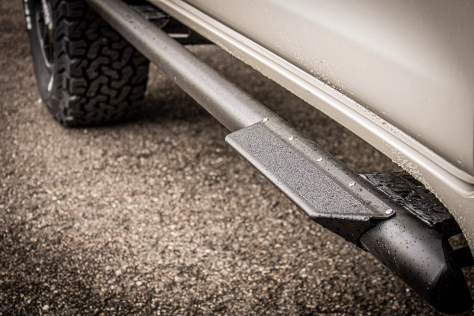 Des marche-pieds robustes offrent une plateforme supplémentaire pour monter et descendre du véhicule. Très pratiques lorsque le véhicule est surélevé, ces marche-pieds le sont aussi lorsqu'il s'agit d'aller chercher du matériel sur le toit du véhicule.