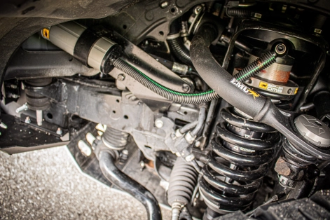 Nous proposons des kits suspensions tout fait, mais parfois il peut être nécessaire de s'adapter à une demande particulière, à un approvisionnement retardé ou à un budget serré. Ici nous avons choisi de monter Des amortisseurs bypass à bonbonne séparée à l'avant accompagné de ressorts OME BP51. Fruit de 4 années de développement intensif et brevetée, BP-51 amène la technologie course pour une utilisation de tous les jours apportant une performance sans précédent en off road et sur la route. C’est l’union du confort et du contrôle. Ces suspensions s’installent sans modifier le véhicule !