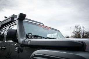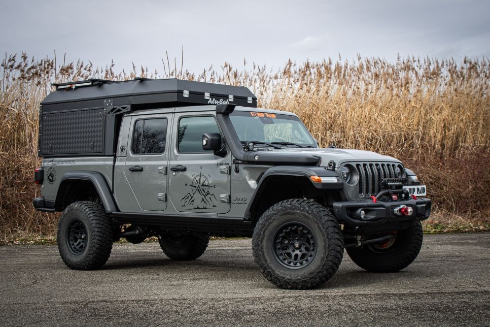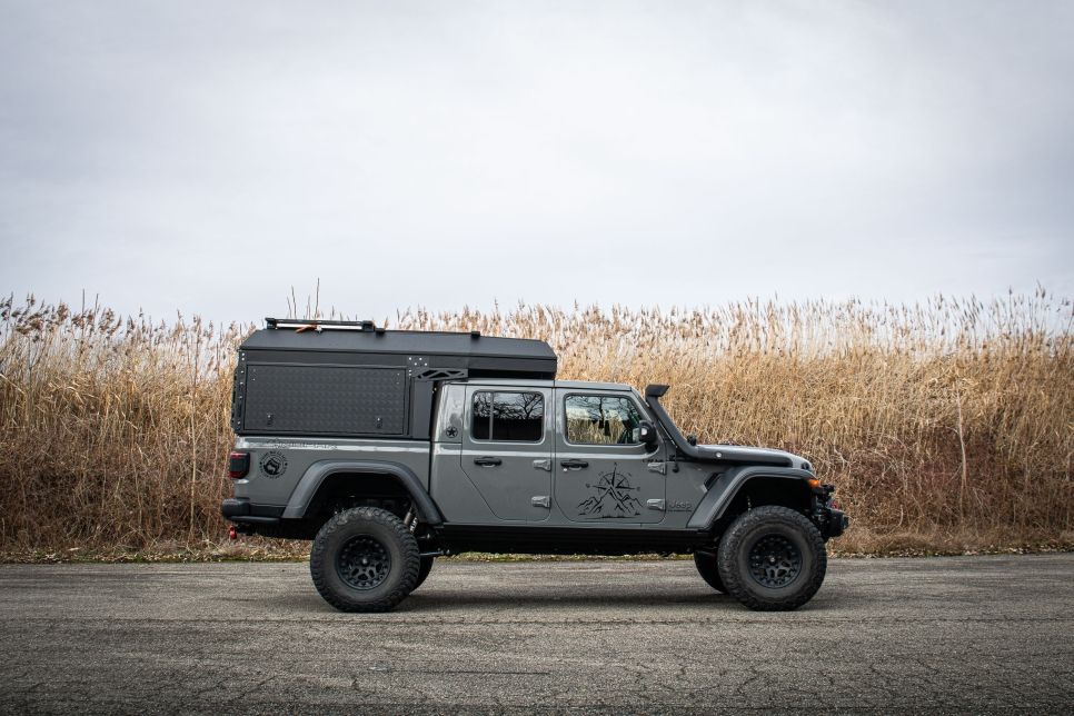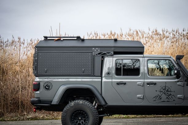 Sur ce Jeep Gladiator JT double cabine (à partir de 2020), nous avons installé une configuration pensée pour un usage baroudeur / bivouac : un Canopy Camper Alu-Cab (hard-top + tente de toit intégrée) avec auvent 270°, une cuisine Deluxe, un frigo à compresseur Dometic, des accessoires canopy (eau, portage, table), puis une installation électrique autonome (batterie lithium, recharge alternateur + solaire, 230V) et enfin un chauffage Webasto pour voyager toute l’année.