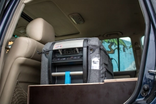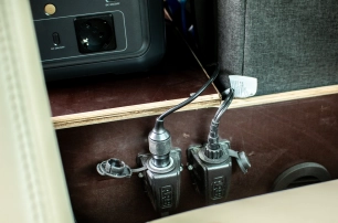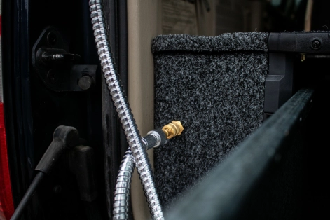 Notre atelier a réalisé le circuit d'eau froide avec 2 prises de raccordement rapide (une au niveau du coffre et une au niveau de la porte arrière droite). La pompe est commandée par un petit bouton placé à l'arrière.