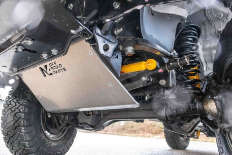 Un blindage avant, qui va protéger le bas de réservoir et du moteur, ainsi qu'un blindage central qui va protéger les boites de transfert et le réservoir d'origine.
