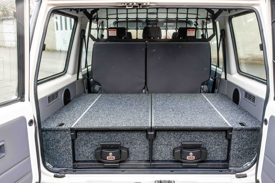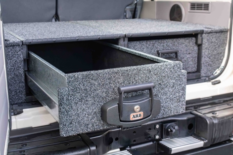 Pour optimiser le chargement du véhicule, les aménagement double tiroirs ARB sont une référence. Disponibles également avec plateau coulissant, ils permettent de ranger le matériel sensible dans les tiroirs et de bénéficier d'un volume conséquent pour du matériel au dessus. De chaque côté, des espaces supplémentaires de rangements permettent au choix d'installer un équipement électrique ou de stocker du matériel supplémentaire.