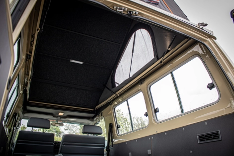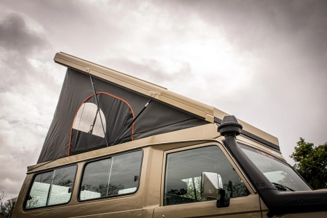 Le remplacement du toit d'origine par un toit relevable augmente la hauteur du véhicule de 9cm et le poids de 116kg. L'installation d'amortisseurs spécifiques est donc particulièrement recommandé. Réalisé en aluminium 2mm, des rails cargo sont fixés sur le toit de la tente poiur une fixation facile de barres de toit.