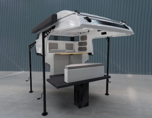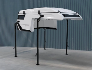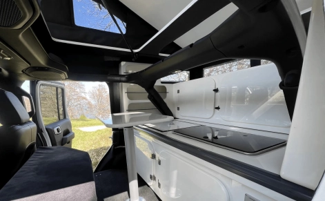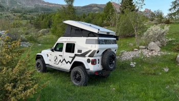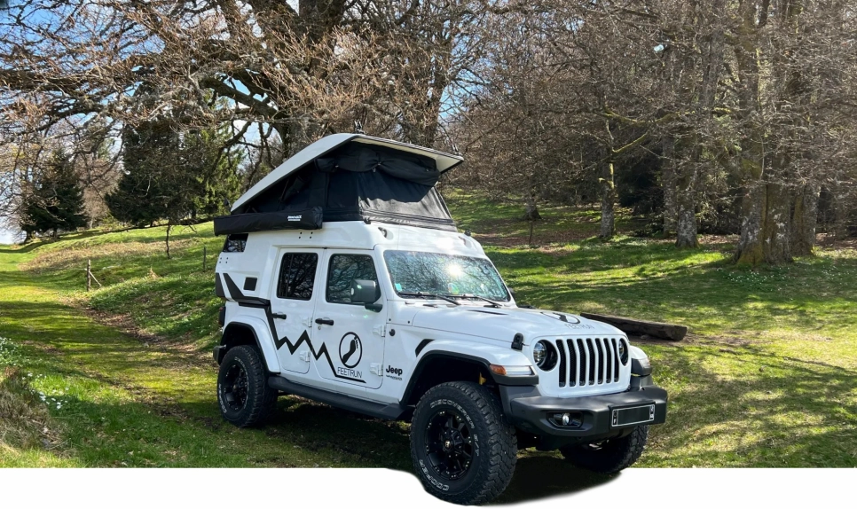 The FeetRun hard top with pop-up roof is fitted in place of the original hard top in a matter of minutes and without any modification to the vehicle. The rear section is about 20 cm wider, does not protrude beyond the fenders of the jeep and is about 30 cm higher, with a flip-up roof creating a comfortable space.
