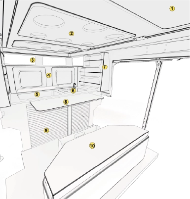 All the interior fittings are made of moulded polyester parts so that nothing is sacrificed in terms of resistance and ease of maintenance, nor in terms of functionality and the wealth of equipment.