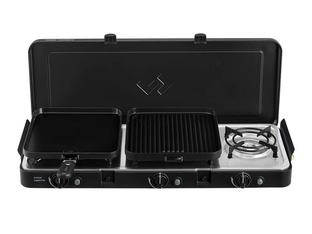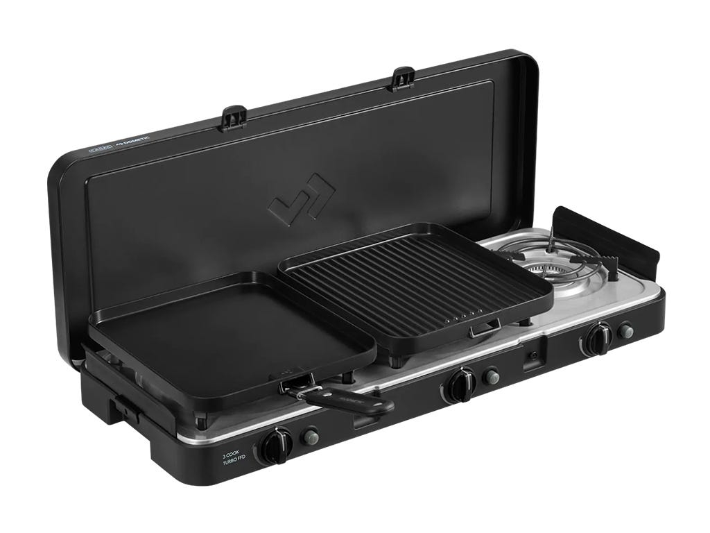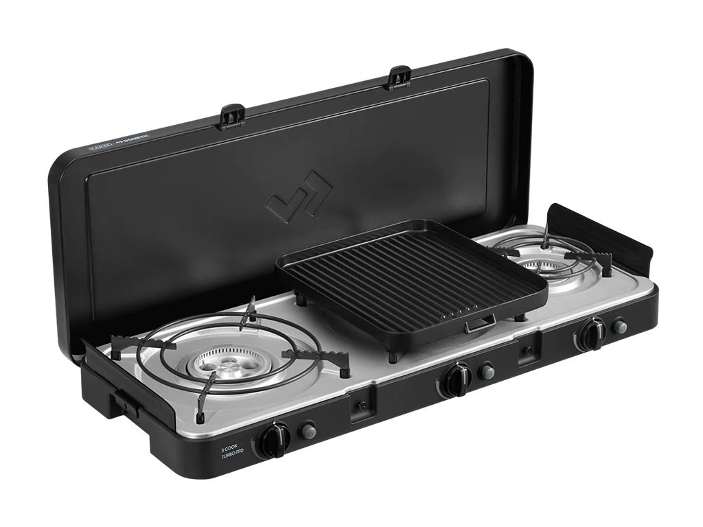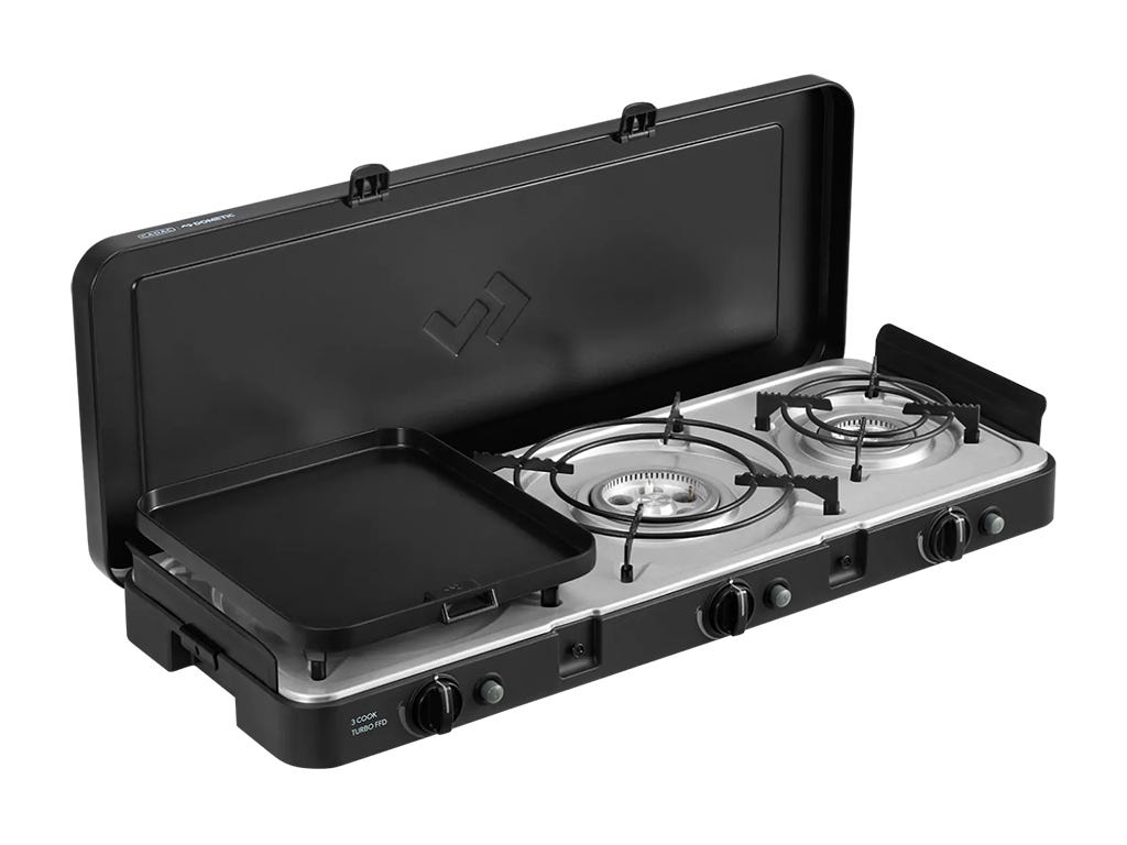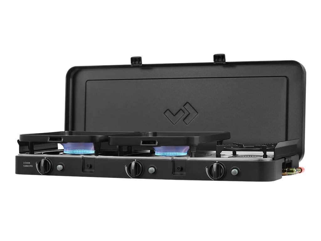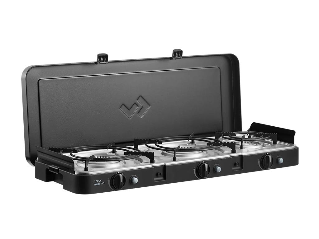 Le 3 Cook Turbo Deluxe / 30mbar dispose de trois brûleurs de haute qualité, ce qui en fait le réchaud à gaz d'extérieur indispensable pour ceux qui doivent préparer beaucoup de nourriture ou pour un grand groupe. Les trois brûleurs du 3 Cook Turbo Deluxe peuvent être utilisés simultanément. Ainsi, pendant que vous attendez que la bouilloire bouillonne, vous pouvez faire frire des oeufs sur un autre brûleur et griller des saucisses sur le troisième brûleur. Chaque brûleur est équipé d'un dispositif d'extinction de la flamme, de sorte que le gaz s'éteint automatiquement si la flamme s'éteint.
