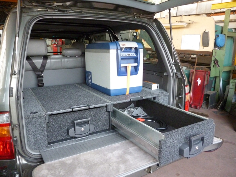 - un tiroir avec couvercle sur glissière : ce tiroir donne un grand espace de stockage et la possibilité de monter un réfrigérateur sur son couvercle, qui pourra être tiré dans et hors du votre véhicule. Contrairement aux autres produits de ce type c'est le seul à avoir une surface complètement plate qui fait que la surface de chargement est optimale si vous n'utilisez pas de réfrigérateur. Dimensions : 1045 x 535 x 280 mm
