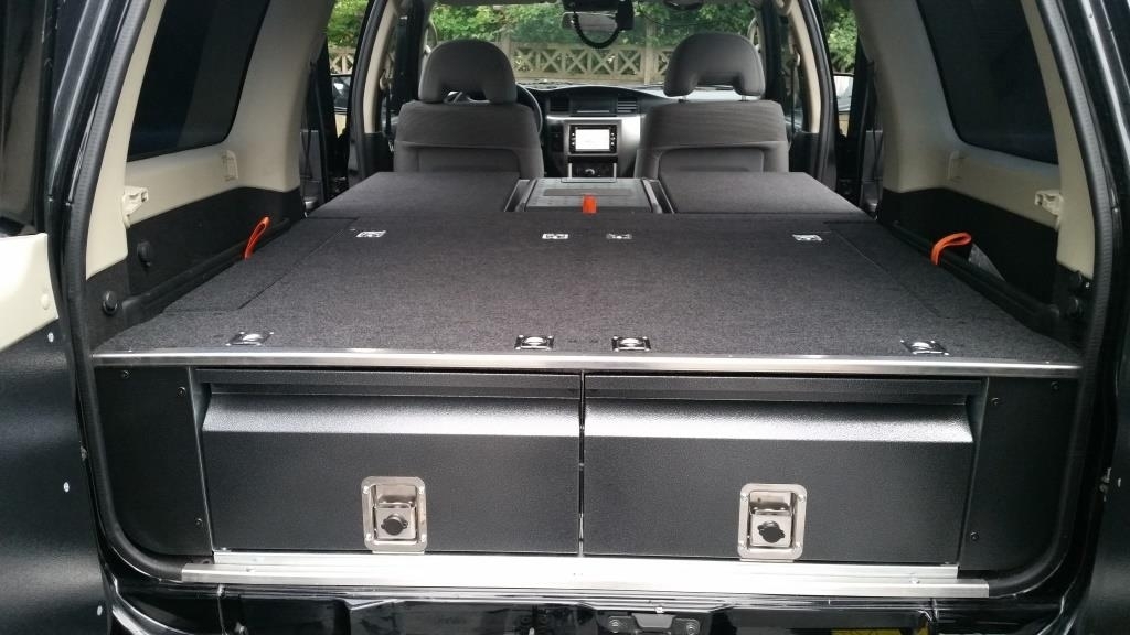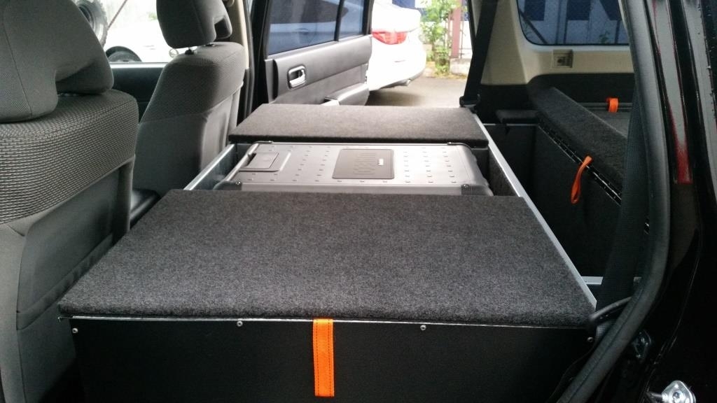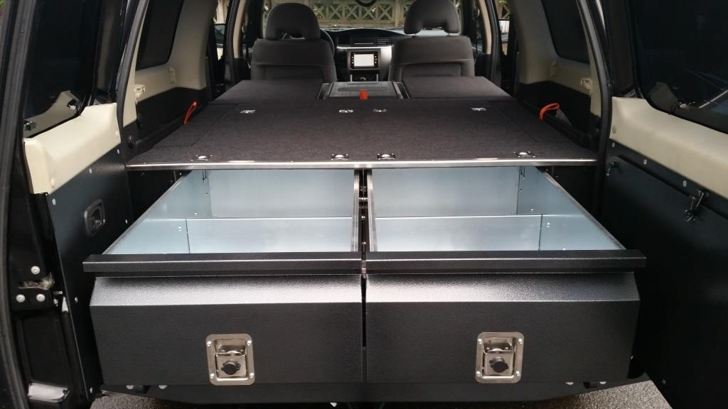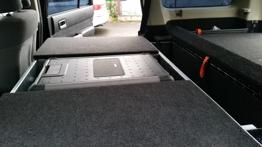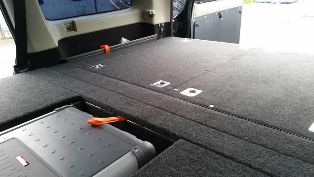 À la place de la banquette arrière, des coffres supplémentaires sont montés, cela permet un ensemble plat destiné à dormir.