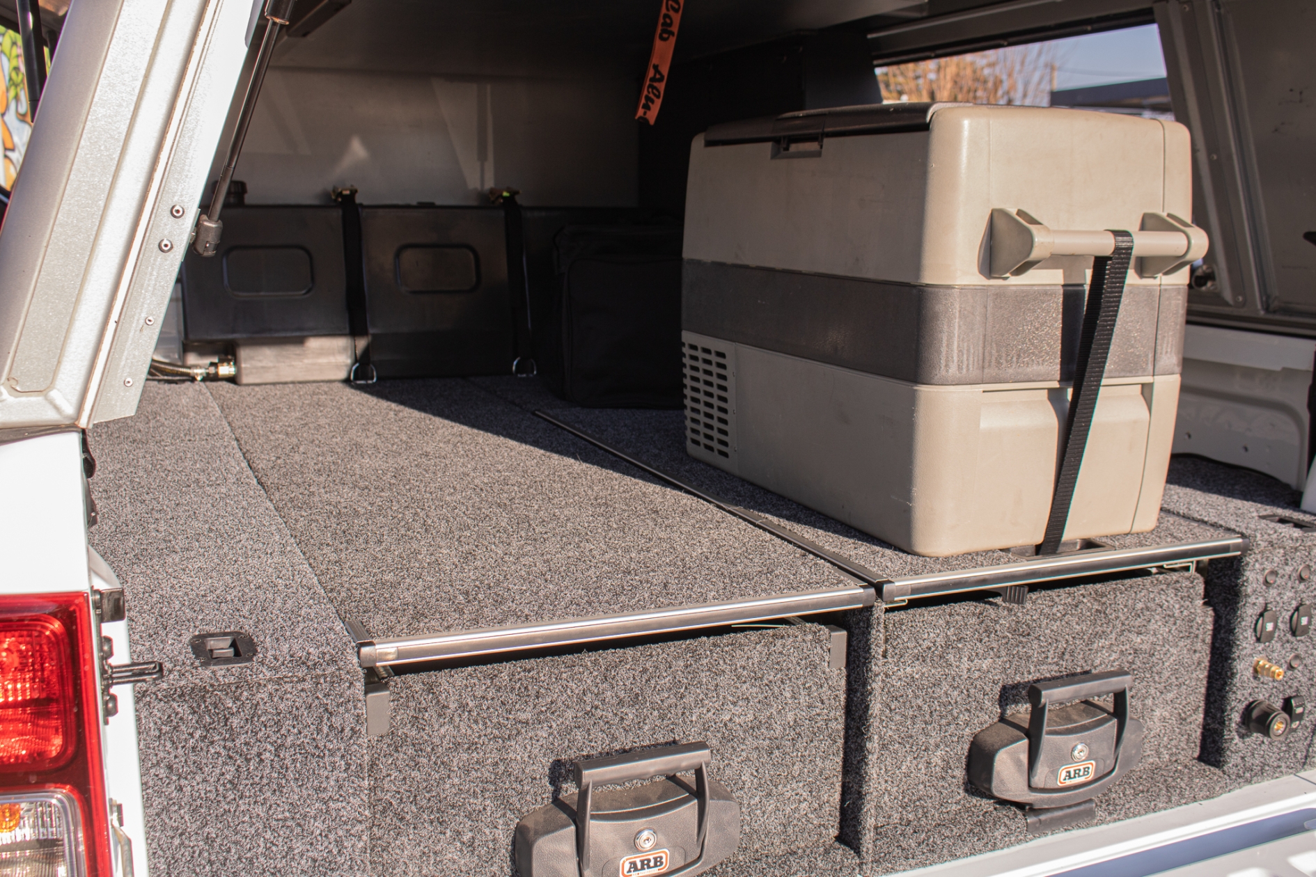 - un tiroir avec couvercle sur glissière : ce tiroir donne un grand espace de stockage et la possibilité de monter un réfrigérateur sur son couvercle, qui pourra être tiré dans et hors du votre véhicule. Contrairement aux autres produits de ce type c'est le seul à avoir une surface complètement plate qui fait que la surface de chargement est optimale si vous n'utilisez pas de réfrigérateur. Dimensions : 1355 x 505 x 310 mm