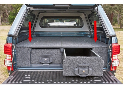 - un tiroir avec couvercle sur glissière : ce tiroir donne un grand espace de stockage et la possibilité de monter un réfrigérateur sur son couvercle, qui pourra être tiré dans et hors du votre véhicule. Contrairement aux autres produits de ce type c'est le seul à avoir une surface complètement plate qui fait que la surface de chargement est optimale si vous n'utilisez pas de réfrigérateur. Dimensions : 1355 x 505 x 310 mm