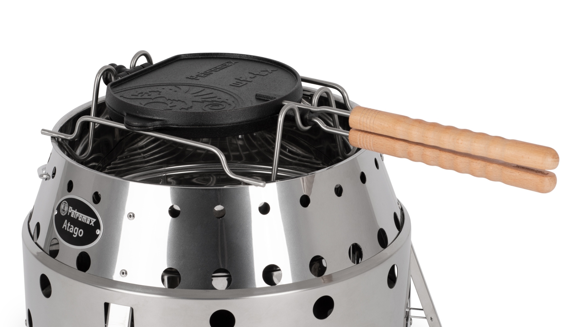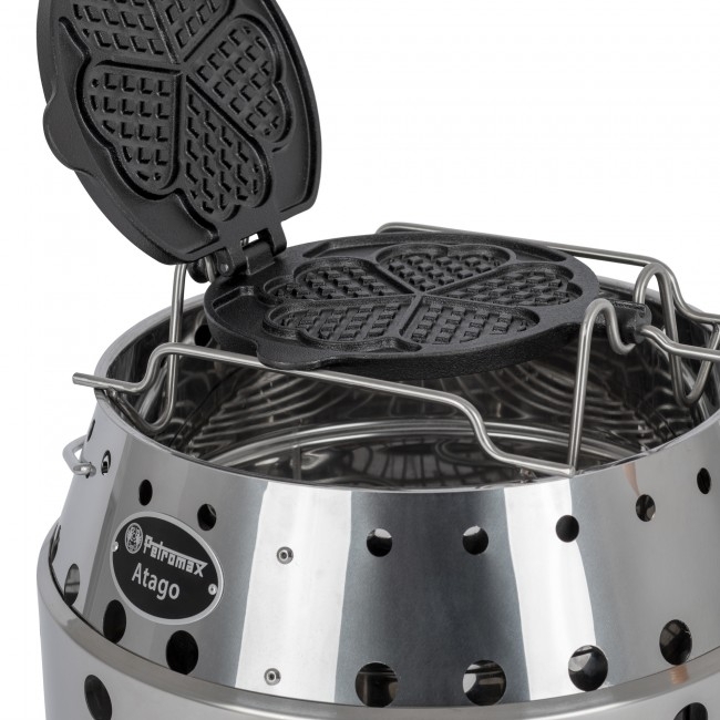 L'Atago est la zone de cuisine de plein air idéale pour utiliser votre Appareil à gaufres rotatif : Le support pour l'Appareil à gaufres s’insère parfaitement sur la paroi supérieure. La distance entre le support et la grille de charbon est assez importante pour faire cuire les gaufres en chaleur indirecte, vous obtenez ainsi les meilleurs résultats possibles et disposez de toute la place nécessaire pour effectuer des manœuvres astucieuses.