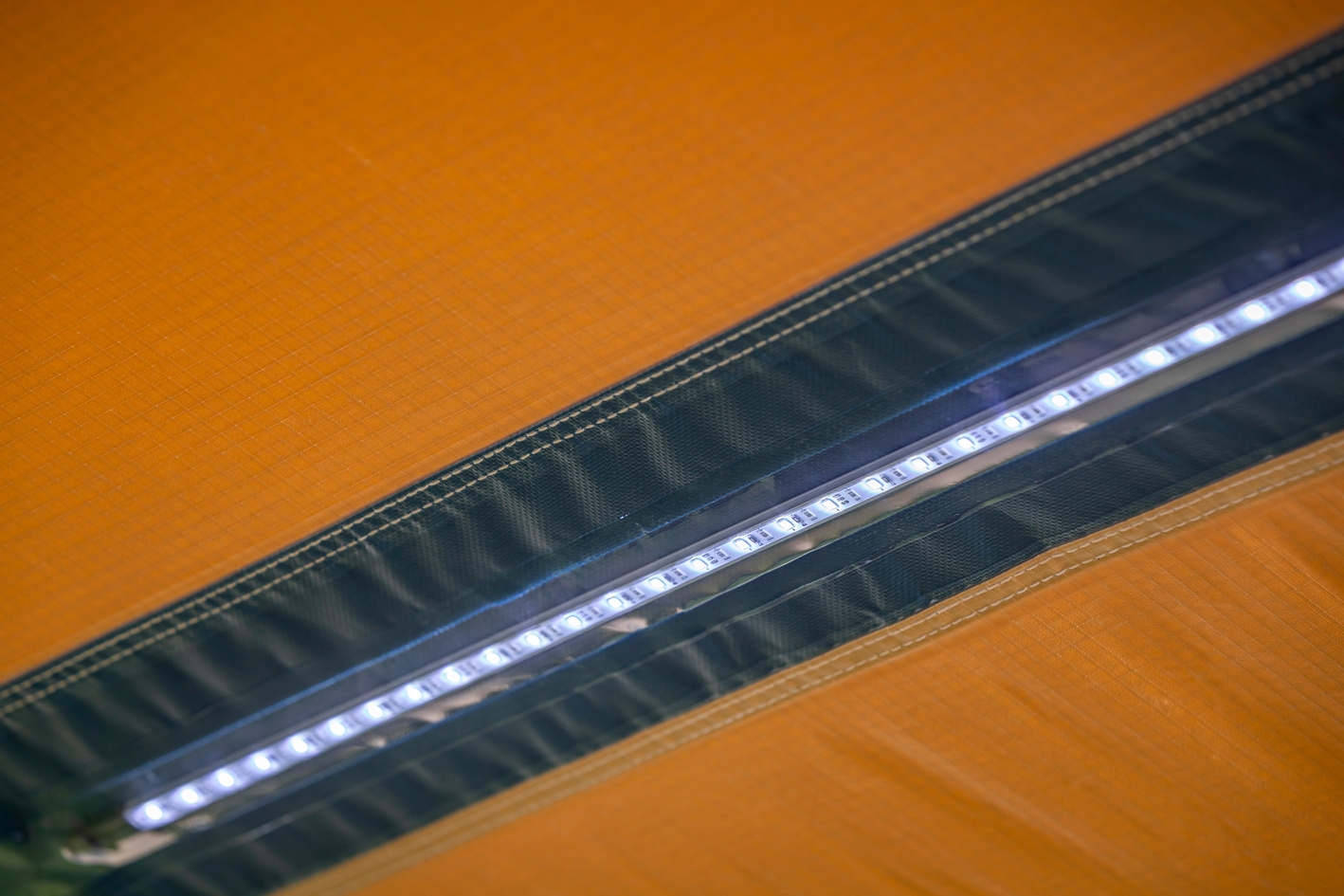 Sous la toile, la bande lumineuse LED fournit jusqu'à 1200 lumens, avec un choix de deux modes de couleur différents (blanc froid ou ambre) et un gradateur alimentés via une prise de courant à fusible.