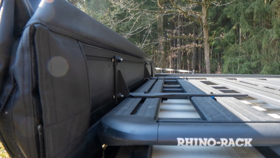 L'auvent Batwing 180° se déploie depuis le côté de votre véhicule pour créer un espace ombragé et abrité de 8,4 m² (180°) sans nécessiter de perçage supplémentaire : les supports (Halter) inclus se fixent directement sur vos barres Rhino-Rack existantes.