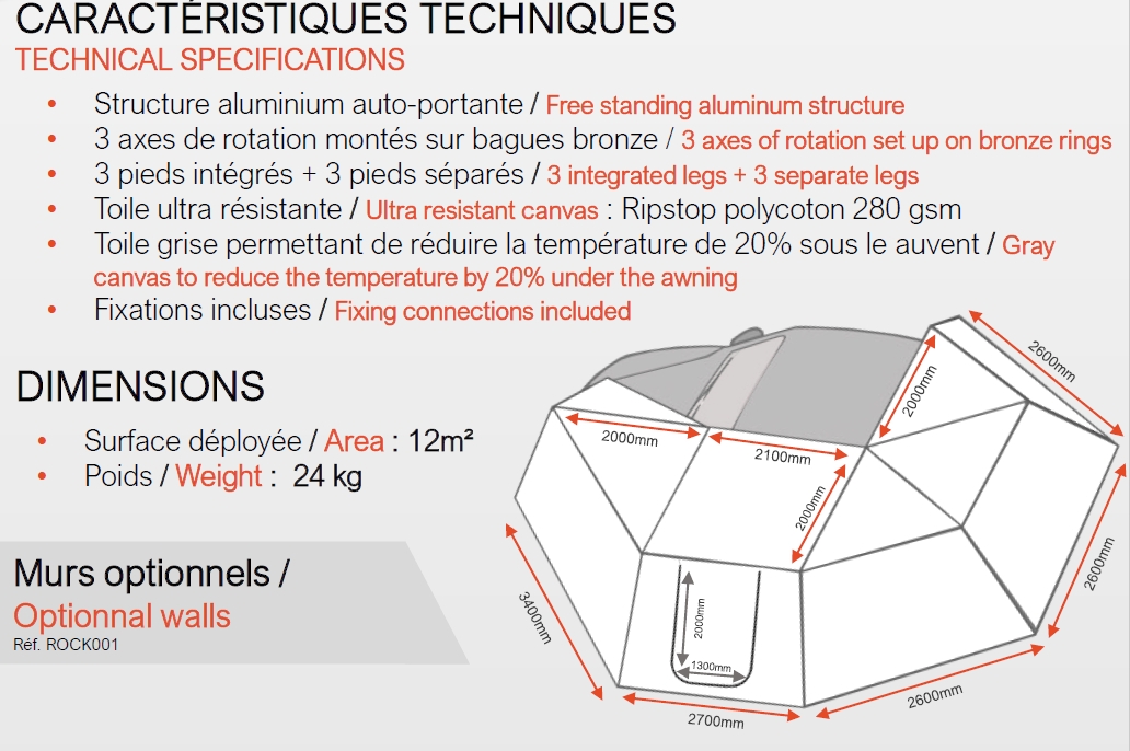 - Accessoires disponibles : murs latéraux, LED, moustiquaires, etc.