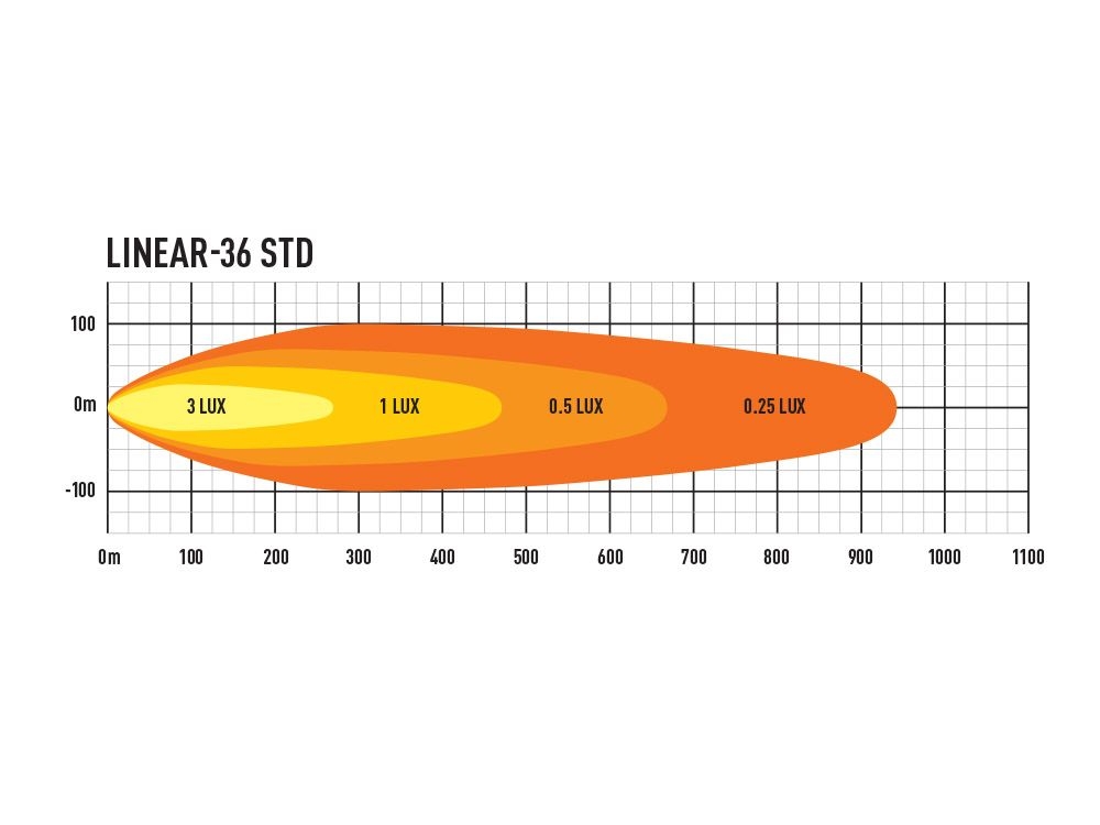 D'une longueur de 982 mm (39"), le Linear-36 comprend 36 LED haute densité soigneusement sélectionnées pour leur puissance de sortie supérieure, leur température de couleur à 5000 kelvin et leurs performances thermiques (fournissant une longévité améliorée). Émettant un total de 13 500 lumens, la lampe délivre 1 lux à 470 m via des optiques métallisées sous vide ultra-réfléchissantes finement réglées pour fournir un éclairage à distance proche de la limite des réglementations routières européennes, et une incroyable diffusion gauche/droite de la lumière qui rend la conduite de nuit beaucoup plus agréable et sûre.