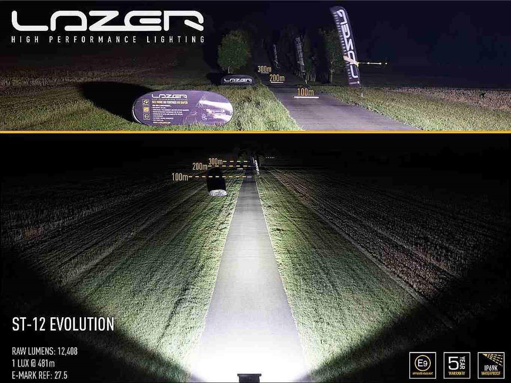 Avec un flux lumineux de 12 408 lumens, le phare Lazer Lamps ST12 Evolution a autant de puissance que quatre spots xénon ou est même plus puissant que douze spots halogènes H4. La répartition lumineuse hybride assure une excellente portée et un large éclairage à courte et moyenne distance et offre ainsi au conducteur d'excellentes conditions de vision nocturne. La portée est un incroyable 962 mètres.