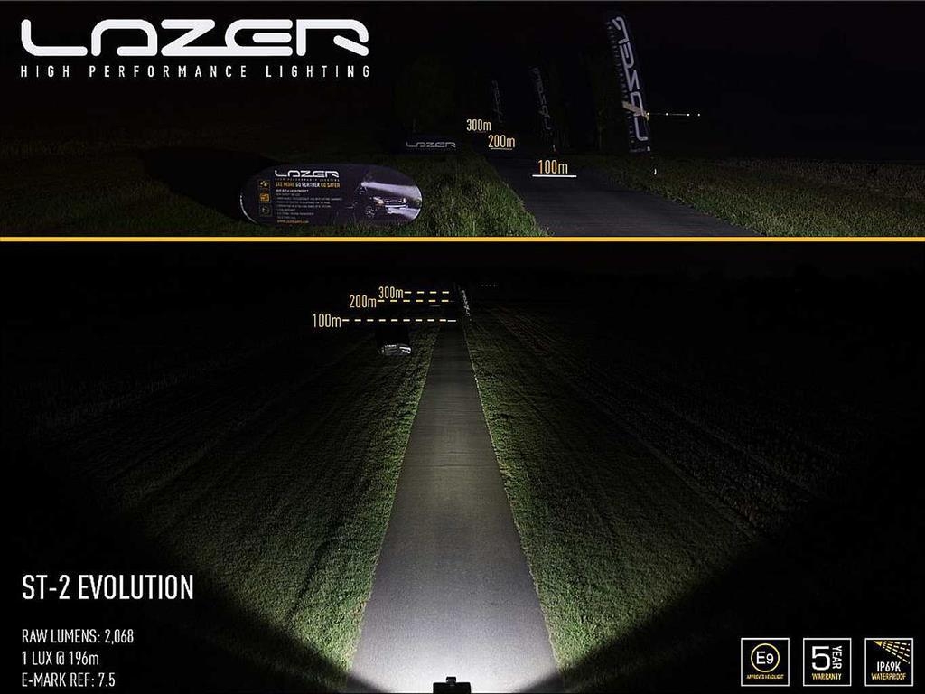 Avec un flux lumineux de 2 068 lumens, le phare compact Lazer Lamps ST2 Evolution est aussi puissant que deux phares de route halogènes H4. La répartition lumineuse hybride assure une excellente portée et un large éclairage à courte et moyenne portée et offre au conducteur d'excellentes conditions de vision nocturne. La portée est d'env. 393 mètres.