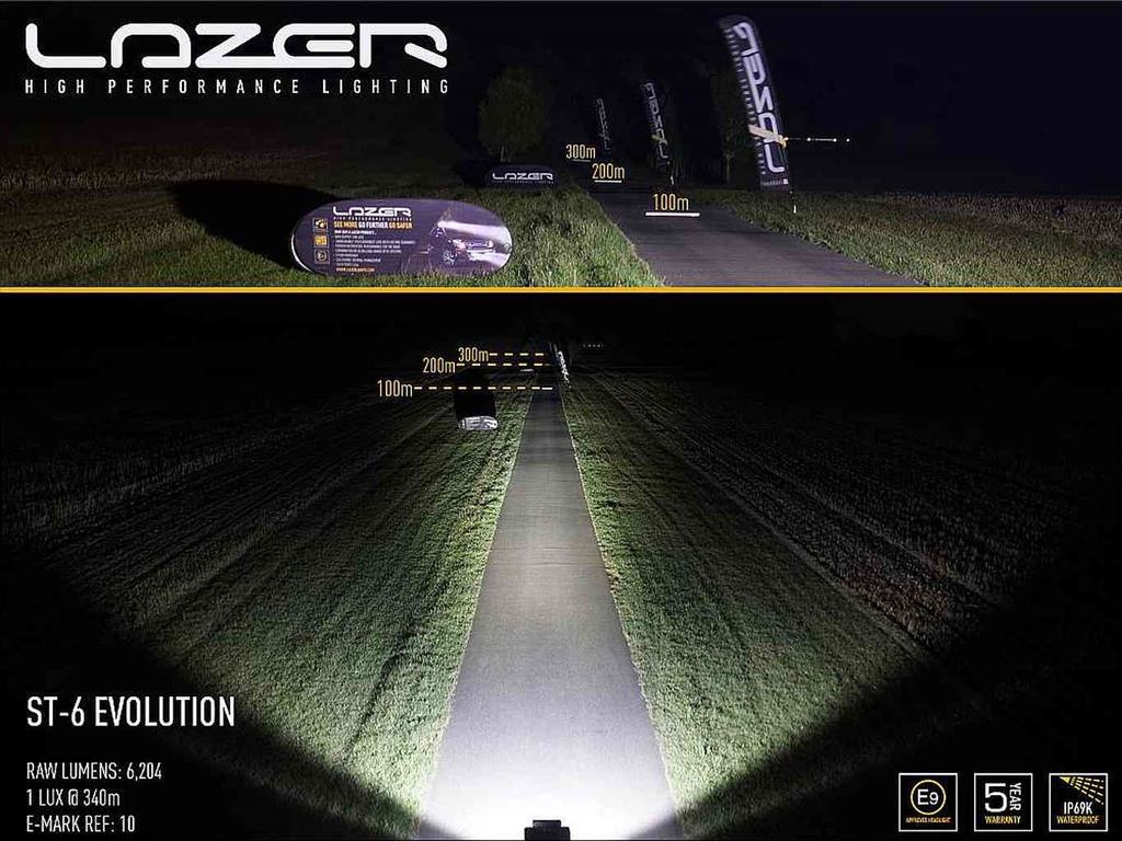 Avec un flux lumineux de 6 204 lumens, le phare Lazer Lamps ST6 Evolution a presque la même puissance que deux phares de route au xénon ou est aussi puissant que six phares de route halogènes H4. La répartition lumineuse hybride assure une excellente portée et un large éclairage à courte et moyenne distance et offre ainsi au conducteur d'excellentes conditions de vision nocturne. La portée est d'env. 680 mètres.