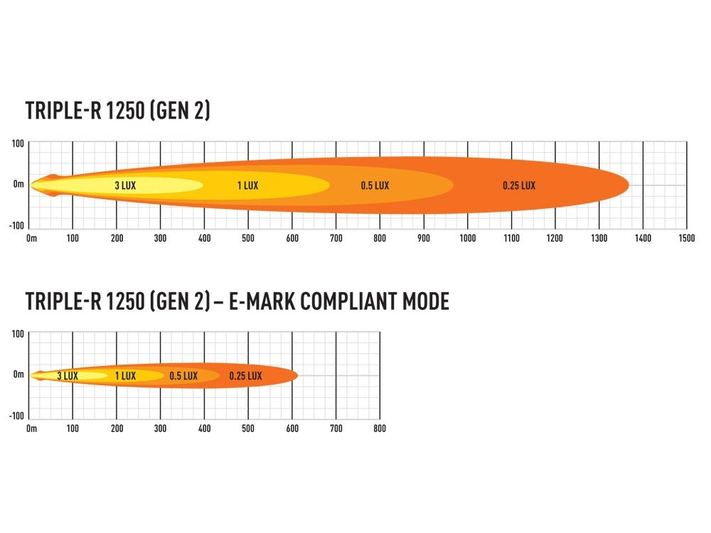 Les modèles Triple-R 750 à Triple-R 1250 sont homologués comme lampes conformément à la réglementation ECE. Unique pour une lampe homologuée, la technologie E-Boost mise en œuvre par les modèles Triple-R Elite (750, 850, 1000 et 1250), une innovation que l'on retrouve dans les lampes Lazer Lamps pour la première fois au monde. En dehors des voies publiques, les lampes peuvent être commutées à pleine puissance en branchant le soi-disant Boost Cap. La portée augmente alors jusqu'à 1500 mètres, selon le modèle. En raison de la configuration flexible des lampes, celles-ci peuvent être utilisées à la fois comme lampes légales et comme faisceaux lumineux à LED. L'installation d'une barre lumineuse supplémentaire peut être omise. Les feux Triple-R avec feu de position sont également homologués comme feux de position et feux conformément à la réglementation ECE.