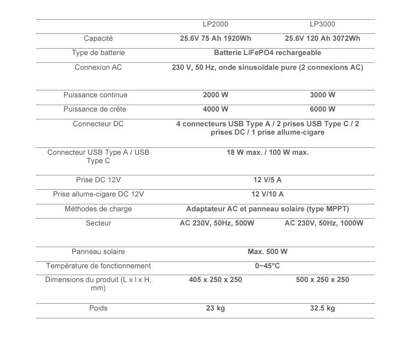 charge maximale de 500W, le LP2000 PRO garantit une recharge