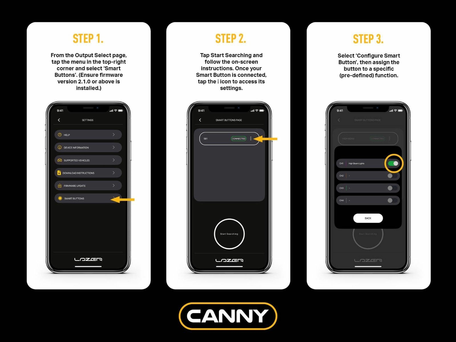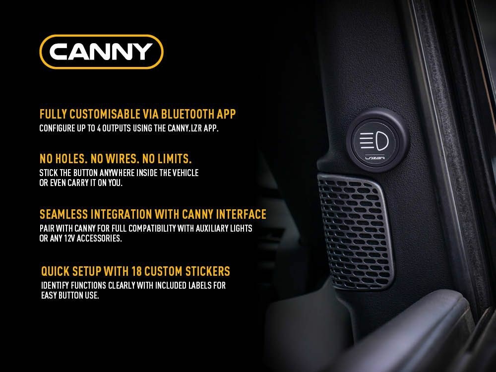 Avec le CANNY Smart Button, Lazer vous propose une solution de commande Bluetooth simple, discrète et ultra-efficace pour piloter vos éclairages auxiliaires ou tout autre accessoire 12V depuis l'endroit de votre choix... ou même directement depuis votre poche.