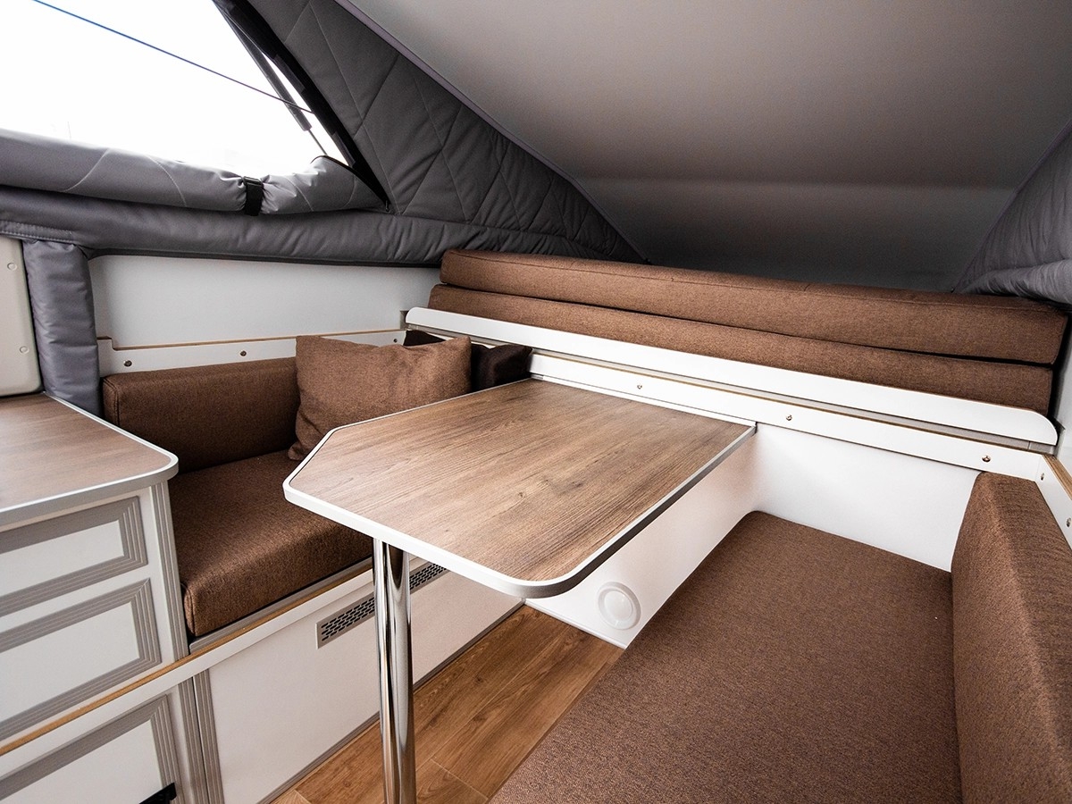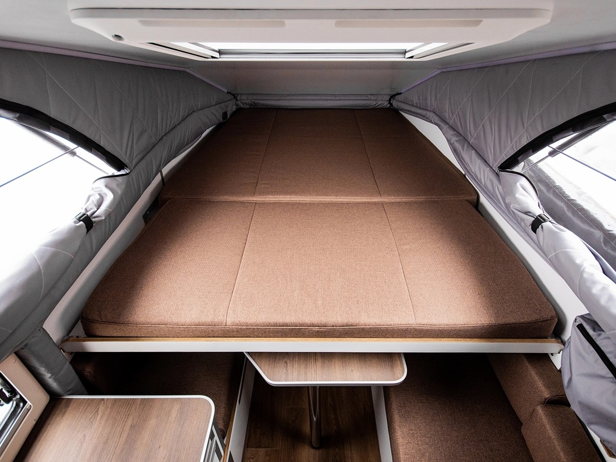 Espace repas convertible en couchage 90 x 170cm, couchage principal en alcôve 160 x 200 cm et rangements optimisés (option supplémentaire : extension du couchage bas 130 x 180cm possible)