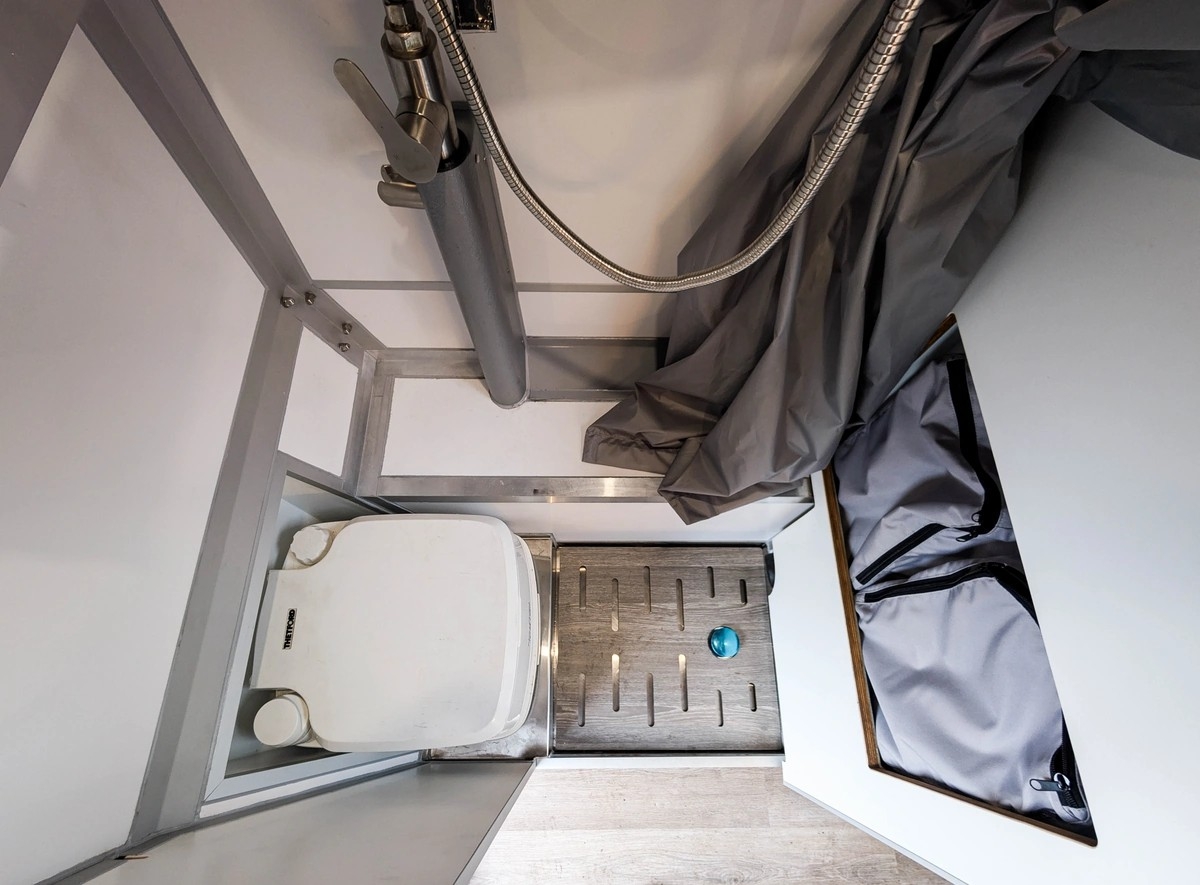 Salle de Bain : Isolée, avec lavabo, douche et espace dédié pour toilette portable.