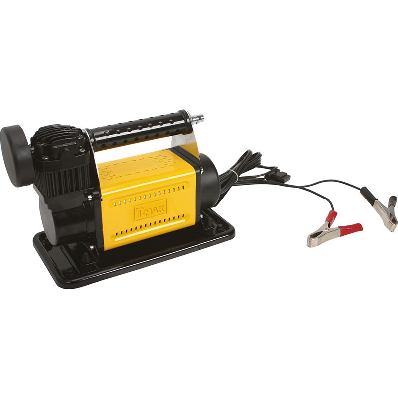 T-MAX Compresseur 12v 72 l/min Compresseur Monocylindre 72 l/min complet avec manomètre, flexible rilsan à raccord rapide, alimentation 12v par pinces croco et sacoche de transport.