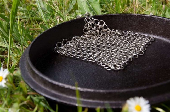 Laisser refroidir le récipient, éventuellement le faire tremper brièvement et frotter soigneusement avec de l'eau chaude et la cotte de mailles à récurer pour enlever les restes de brûlé. Tu n'as bien sûr pas besoin de liquide vaisselle. Après le nettoyage, bien rincer de nouveau. Avant de remettre ton récipient en fonte ou fer forgé dans le placard, toujours bien le sécher et le traiter comme à l'ordinaire. La cotte de mailles à récurer doit aussi bien sécher après usage.