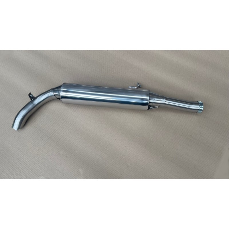 Cette sortie latérale se monte après le tube primaire, elle supprime le catalyseur d’origine. Elle est équipée d’un silencieux à absorption afin de faciliter le flux des gaz et de maintenir la sonorité à un niveau raisonnable. Elle s’intègre parfaitement au plus près de la caisse pour ne pas pénaliser la garde au sol, et pour un aspect esthétique discret et soigné. Le tube de sortie est orienté vers le sol ce qui protège la roue arrière des salissures.