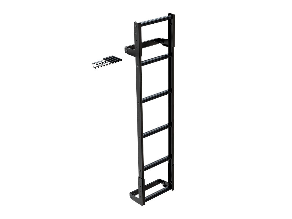 Cette échelle résistante au tout-terrain est le moyen le plus facile de charger et d'accéder au matériel sur votre galerie Front Runner. Cette échelle à six échelons, revêtue de poudre noire, est universelle et se boulonne directement sur la carrosserie ou les portes de grange arrière des fourgons et des SUV de taille moyenne à grande.