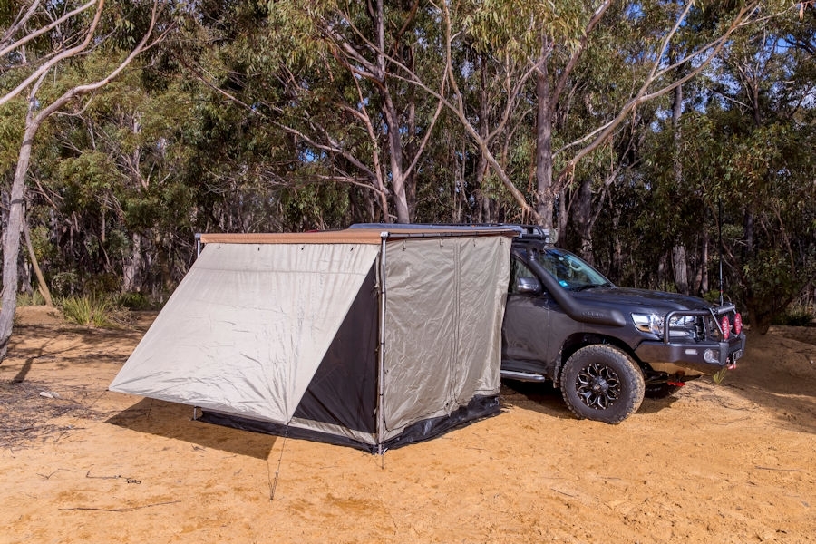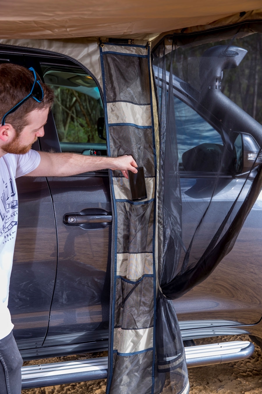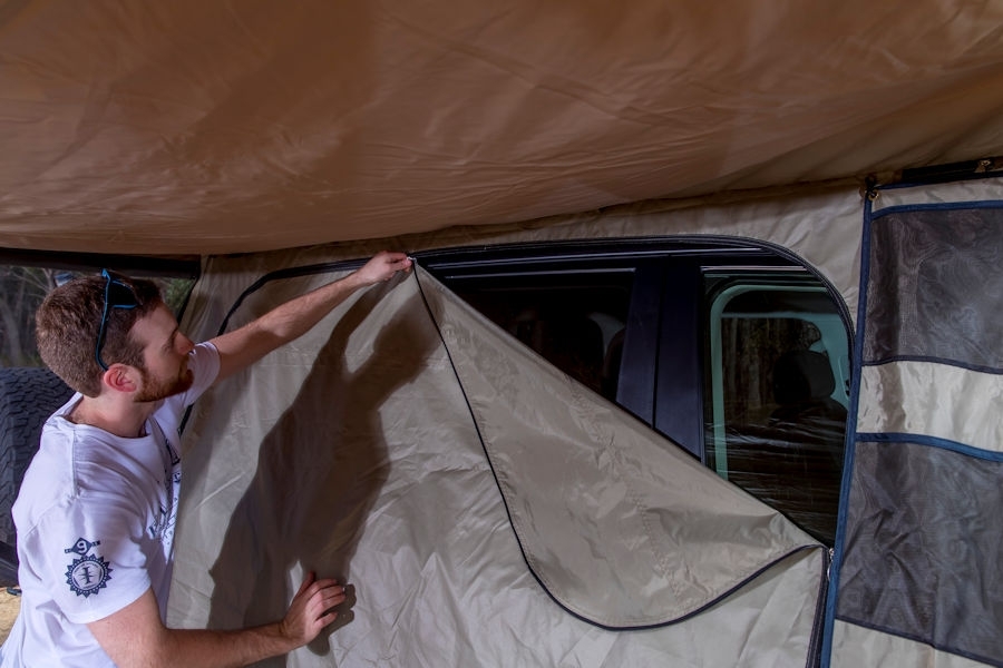 La chambre de luxe auvent comporte un sol imperméable durable et son propre plafond séparé, améliorant ainsi l'isolation du soleil. Tous les panneaux à 4 murs intègrent des portes d'accès à fermeture éclair. La paroi arrière, située vers le véhicule, peut être décompressée pour donner accès au véhicule. L'organisateur de poche en filet peut être situé à droite ou à gauche du panneau arrière pour y ranger vos magazines ou vos objets personnels, pour que tout soit à sa place. Deux ports à fermeture à glissière situés dans les coins supérieurs permettent un accès au câble d'alimentation et des guides de cordon d'alimentation sont incorporés dans les coins du toit pour maintenir les câbles en ordre et en sécurité. Les 3 murs extérieurs sont à double couche et comportent des panneaux extérieurs solides pouvant être fermés par fermeture à glissière pour plus de protection et d'intimité ou bien enroulés pour révéler les panneaux internes en treillis. Le panneau en treillis avant en forme de D peut être entièrement ouvert pour révéler le décor naturel, tandis que le côté en treillis intègre des fermetures à glissière au milieu et à la base pour permettre l’entrée et la sortie de la pièce.