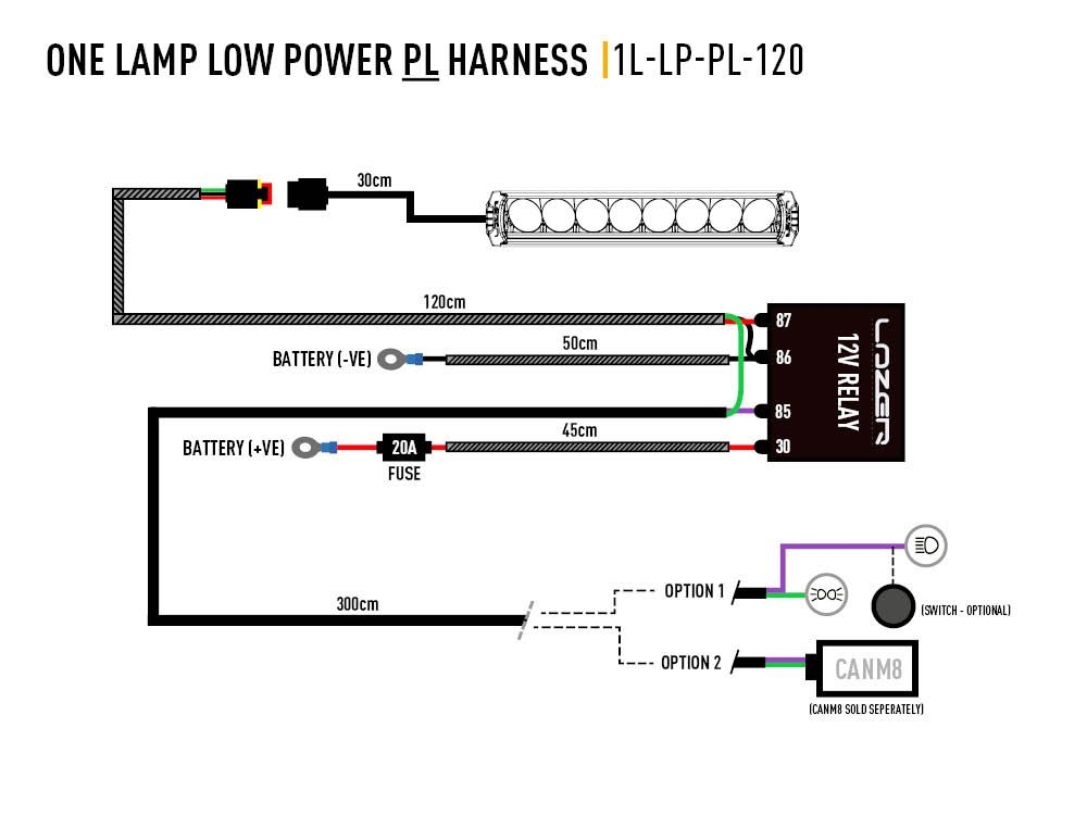 La solution idéale pour le câblage d'un projecteur LED haute performance Lazer, qui dispose également d'une fonction d'éclairage latéral/de position. La configuration est rapide, facile et fiable avec des connecteurs superseal à 3 broches et aucune procédure de configuration. Le kit comprend un relais 12V (dans boîtier étanche), fusible 20A, une borne de batterie à une extrémité et 1,2 m de câble flexible sur le câble de la lampe, et permet le fonctionnement du produit Lazer soit en parallèle avec l'éclairage de série sur le véhicule, et/ou via un interrupteur (pour fonction feux de route) qui peut être monté à l'intérieur de votre véhicule.