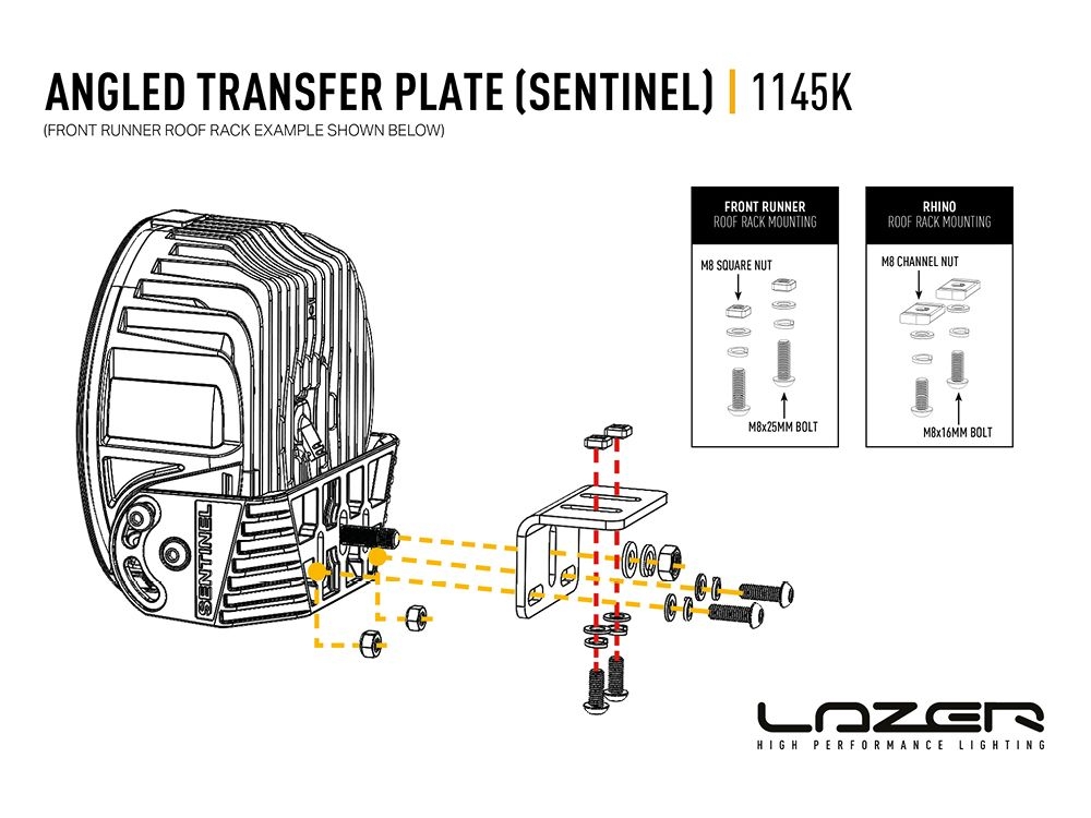 Conçue pour les spots LED Sentinel, la plaque de transfert angulaire est un support de montage à angle droit robuste conçu pour faciliter l'installation là où l'emplacement de montage d'origine n'est pas adapté ou accessible. Cela comprend la facilitation du montage sur les systèmes de galerie de toit, où le support se fixe au canal sur le dessous de votre système de galerie de toit, à l'aide des écrous à fente/carrés fournis, et avec le Sentinel Wide Mount ensuite tourné dans une orientation verticale.
