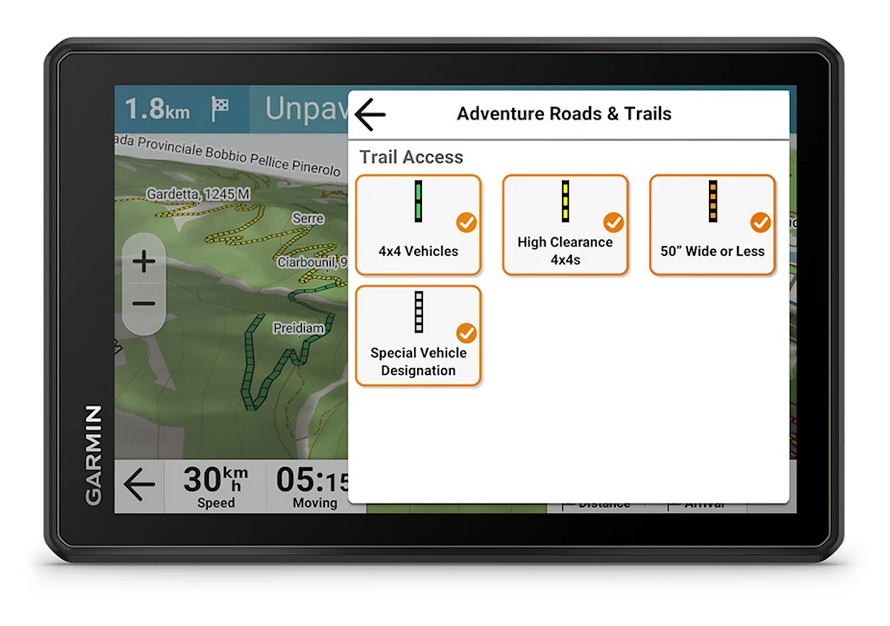 Profitez d'instructions vocales détaillées si vous décidez d'utiliser votre Tread 2 Overland pour votre retour à la civilisation et la navigation sur route.