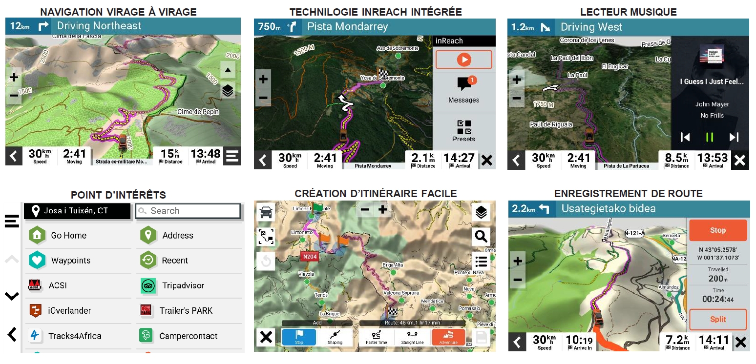 NAVIGATION VIRAGE À VIRAGE | La navigation virage à virage permet de traverser les chemins et routes non pavées grâce aux cartes aventures et trails inclues dans OSM; les cartes route CityNavigator pour la création d’itinéraires personnalisés avec taille et poids du véhicule.