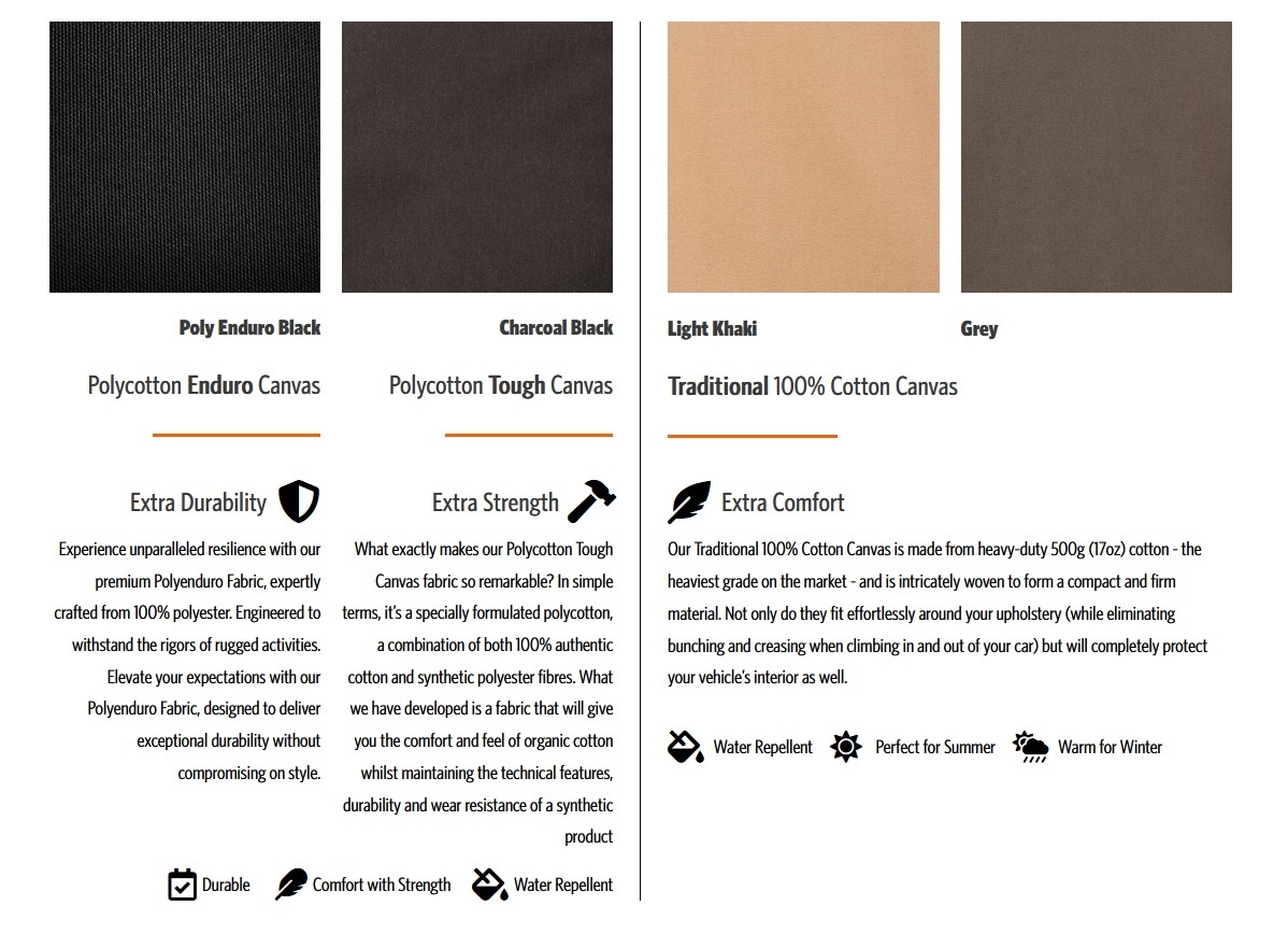 Jeu de housses de sièges spécialement conçu pour le Toyota Land Cruiser Série 76 Station Wagon (modèles 2024 et suivants). Fabriquées en toile canvas en coton résistante, ces housses offrent une excellente protection contre l’usure, la poussière et les salissures tout en conservant un aspect robuste et élégant.