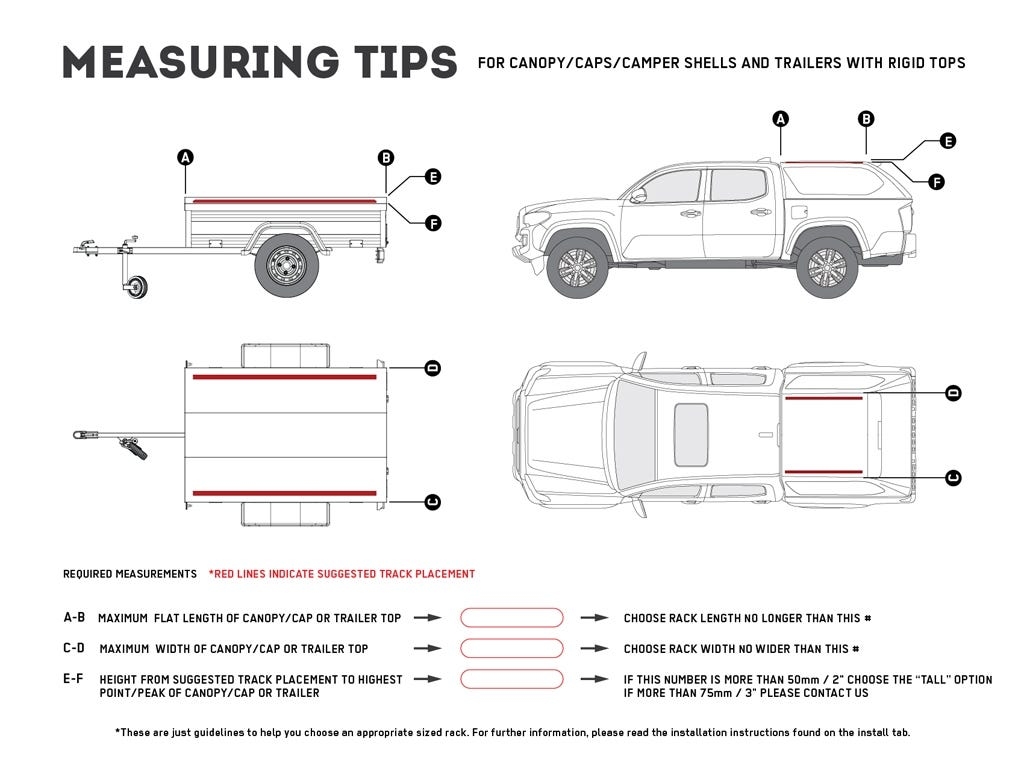 Ce kit de galerie est destiné au hard top de Pick-Up/aux cellules de camping et aux remorques qui ont une dimension de toit approximative de 1165mm/45.9'' (W) x 1358mm/53.5'' (L). Le plateau Slimline II s'installe sur les six (6) pieds fournis qui glissent dans les rails fournis. Les 3 x140mm/5.5''paires de rail d'une peuvent facilement être montée sur votre hard top/cellule ou remorque. Regardez le guide d'installation pour le montage des rails dans l'onglet INSTALL pour plus de détails.