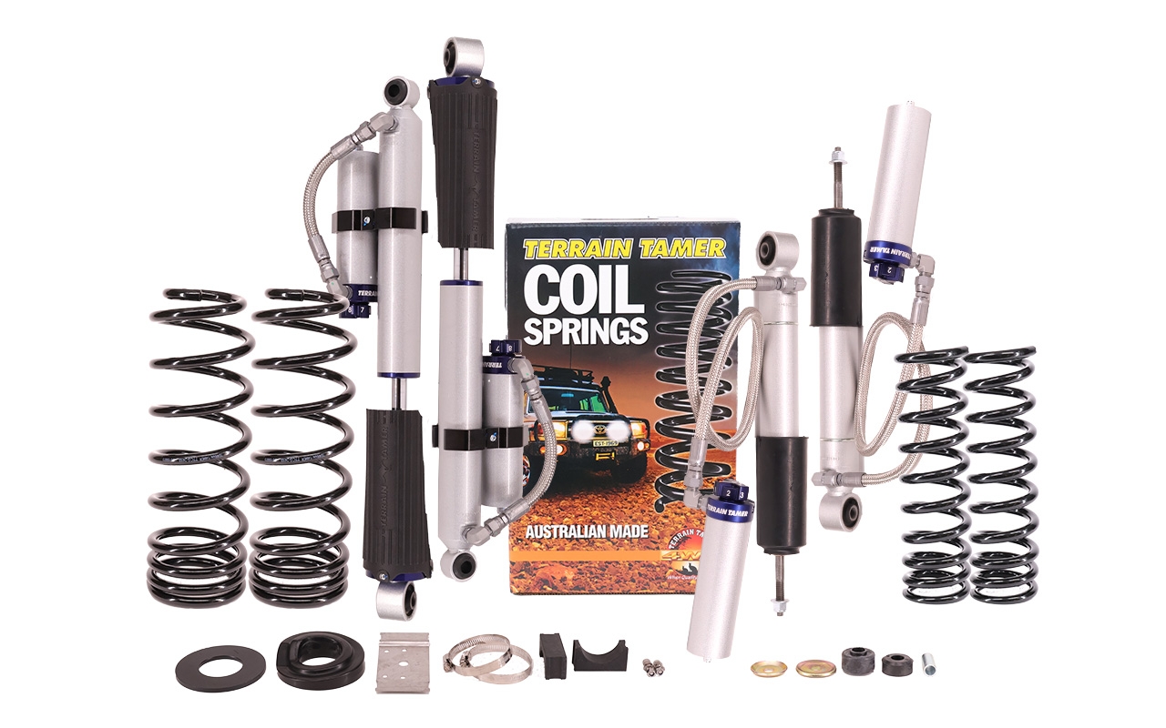 Les kits de suspension Terrain Tamer sont livrés complet, avec les ressorts, les amortisseurs, les lames ainsi que le kit de montage (silent-blocs, brides, axes et jumelles graissable), et l'amortisseur de direction (si disponible pour le véhicule).