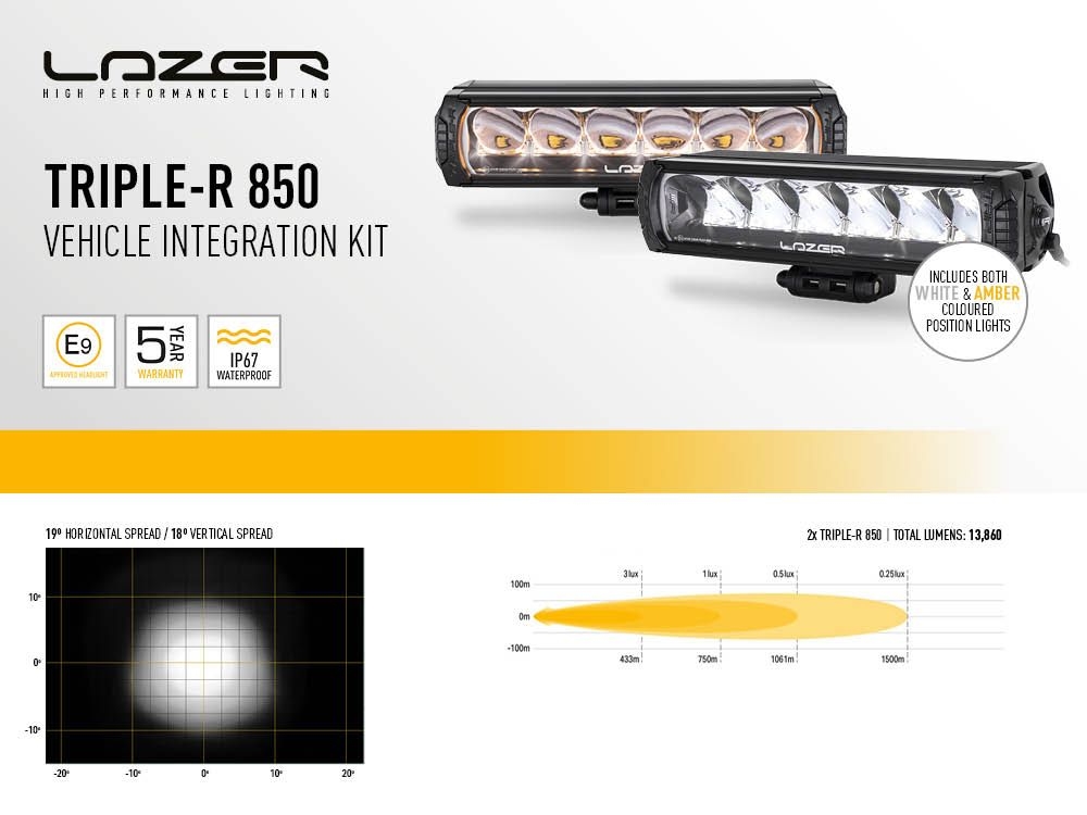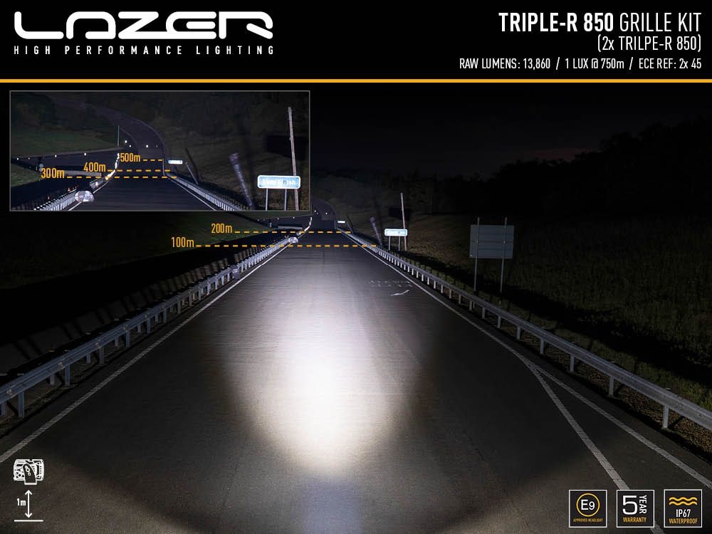 Les modèles Triple-R 750 à Triple-R 1250 sont homologués comme feux de route conformément à la réglementation ECE. Unique pour une lampe homologuée, la technologie E-Boost mise en œuvre par les modèles Triple-R Elite (750, 850, 1000 et 1250), une innovation que l'on retrouve dans les lampes Lazer Lamps pour la première fois au monde. En dehors des voies publiques, les lampes peuvent être commutées à pleine puissance en branchant le soi-disant Boost Cap. La portée augmente alors jusqu'à 1500 mètres, selon le modèle.