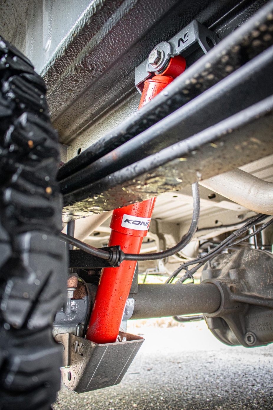 Kit livré complet pour les deux amortisseurs arrières : renforts, tôles de protection, visserie, notice.