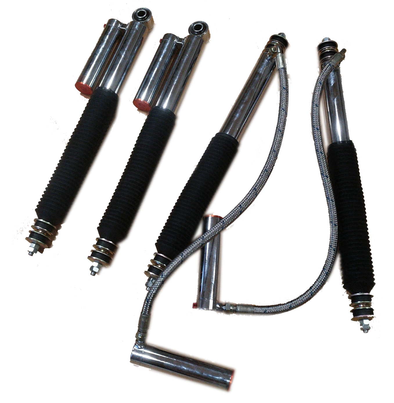 Amortisseurs avant à combiné fileté réglable avec bonbonne séparée et ressorts.