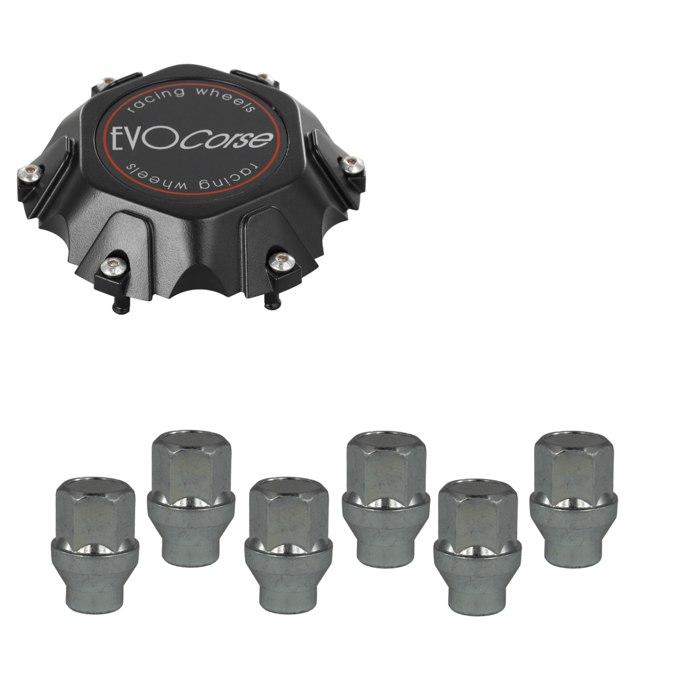 Comprend : 1 enjoliveur tout-terrain, 1 écusson EVO Corse noir et logo noir, 6 écrous de roue chromés fermés avec canon M12x1,50.
