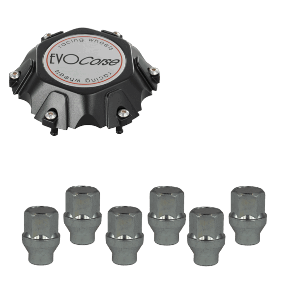 Comprend : 1 enjoliveur tout-terrain, 1 écusson EVO Corse et logo noir, 6 écrous de roue chromés fermés avec canon M12x1,50.