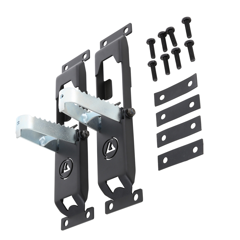 Les marches de porte Smittybilt Atlas se boulonnent sur la charnière de la porte d’usine et permettent d’accéder facilement aux éléments de la galerie de toit et de faciliter l’ouverture des tentes de toit.