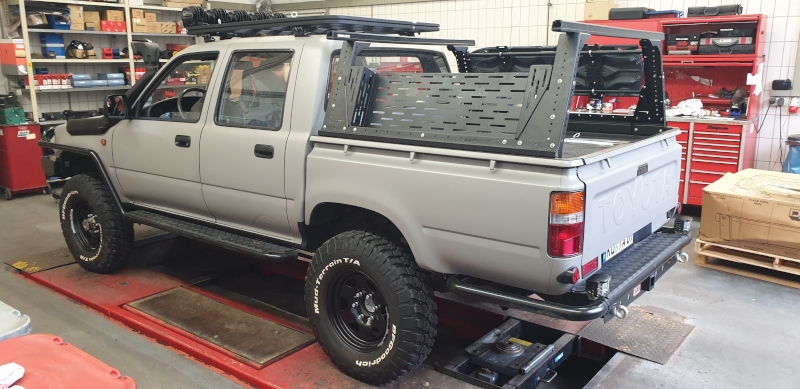 La version haute du support multi rack system est fournie avec des entretoises en tubes ronds. Si vous souhaitez personnaliser davantage cela, vous pouvez compléter le multi rack system avec les différents portes-tout, l’arrêt de charge avec grille de protection et le 3e feux stop. Ceux-ci sont vendus séparément. Des supports pour bidons, pelles, hi-lifts, etc. peuvent alors être montés dessus.