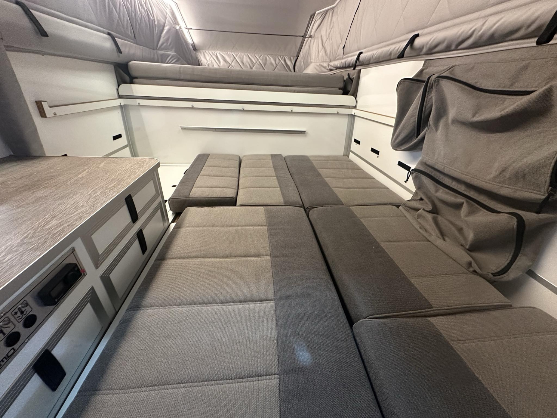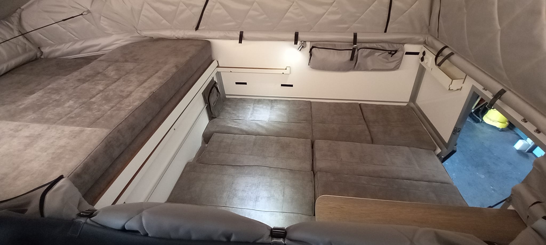 En plus du couchage principale il est possible d'étendre le couchage bas pour une dimension de 130 x 180cm qui permet de dormir à deux dans la partie basse de la cellule sans relever le toit.