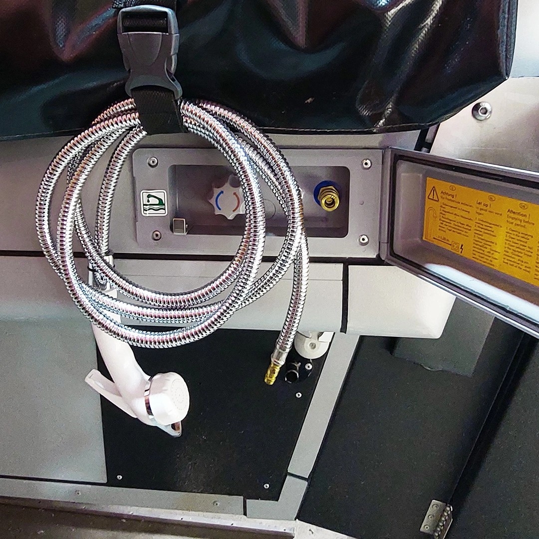 | Passer le tuyau par la fenêtre (perte de chaleur/intrusion). | Raccord Rapide Intégré sous la trappe. | Gain de temps et confort : branchement du tuyau de douche en quelques secondes. |