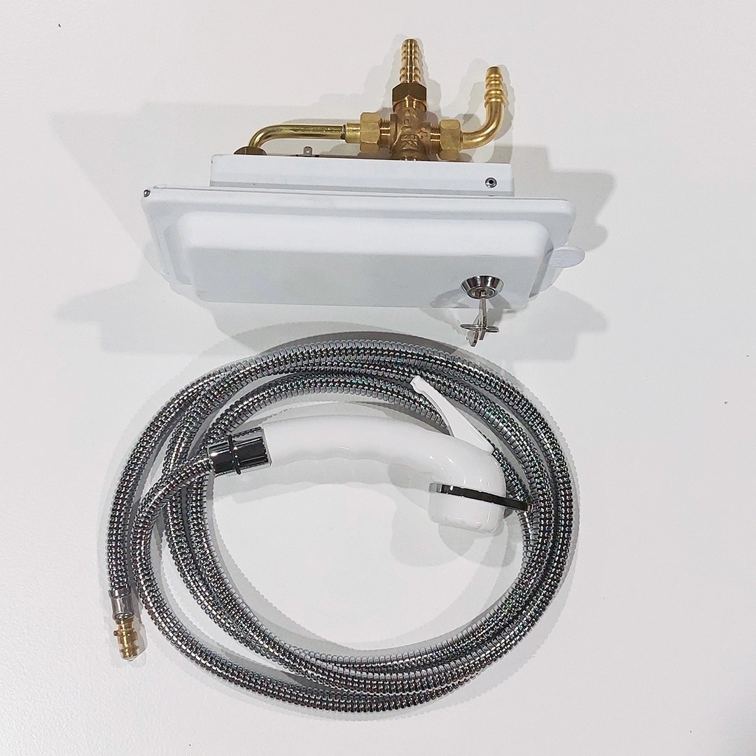 Vous utilisez régulièrement la douche extérieure de votre cellule Ormo Camper ? Vous en avez assez de passer le tuyau par la fenêtre et de jongler avec le robinet de cuisine pour régler la température ?